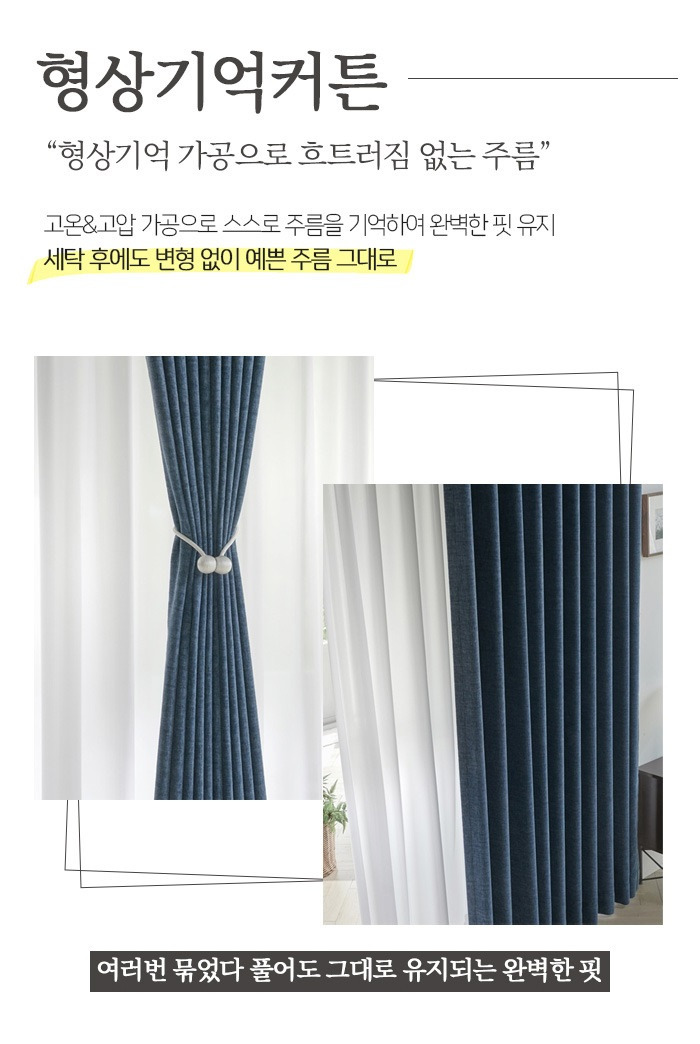 그중에 특히나 인기있고 이목을 집중시키는게 형상 기억 커튼이랍니다. 커튼이 단순히 어떤 패턴들을 지녔느냐에 의해서만 디자인이 결정되는 것이 아니에요.지금 많은 분들이 찾고 있는 것은 형상 기억 커튼이라 할 수 있겠답니다.그러나 이 형상 기억 커튼은 고온과 고압의 특수한 원단 사용을 하는 가공기법을 사용해가면서 제작이 이뤄지기에 커튼을 제작하실 경우 최초로 잡아두었던 자연스런 주름과 볼륨을 계속해서 유지될 수 있어요.