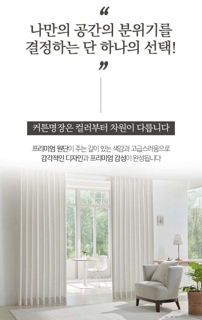 더욱이 커튼과 블라인드는 단순하게 인테리어 면에서만 필요한 것이 아니랍니다. 디자인적인 요소나 실용성을 함께 챙겨 주는 것이 블라인드와 커튼이랍니다.한사람의 일상 생활에서도 더욱 편안하며 쾌적하게 만들어주거니와 사생활 보호는 물론 그리고 인테리어적으로도 아주 중요한 역할을 도맡고 있어요. 이런 만큼 제품을 정하는 것부터 설치하는 과정까지 신중히 접근하시는 게 중요한 부분이겠습니다.커튼 명장은 어떠한 커튼과 블라인드가 어울리는지를 다양한 각도로 살피셔서 도움을 드린답니다.